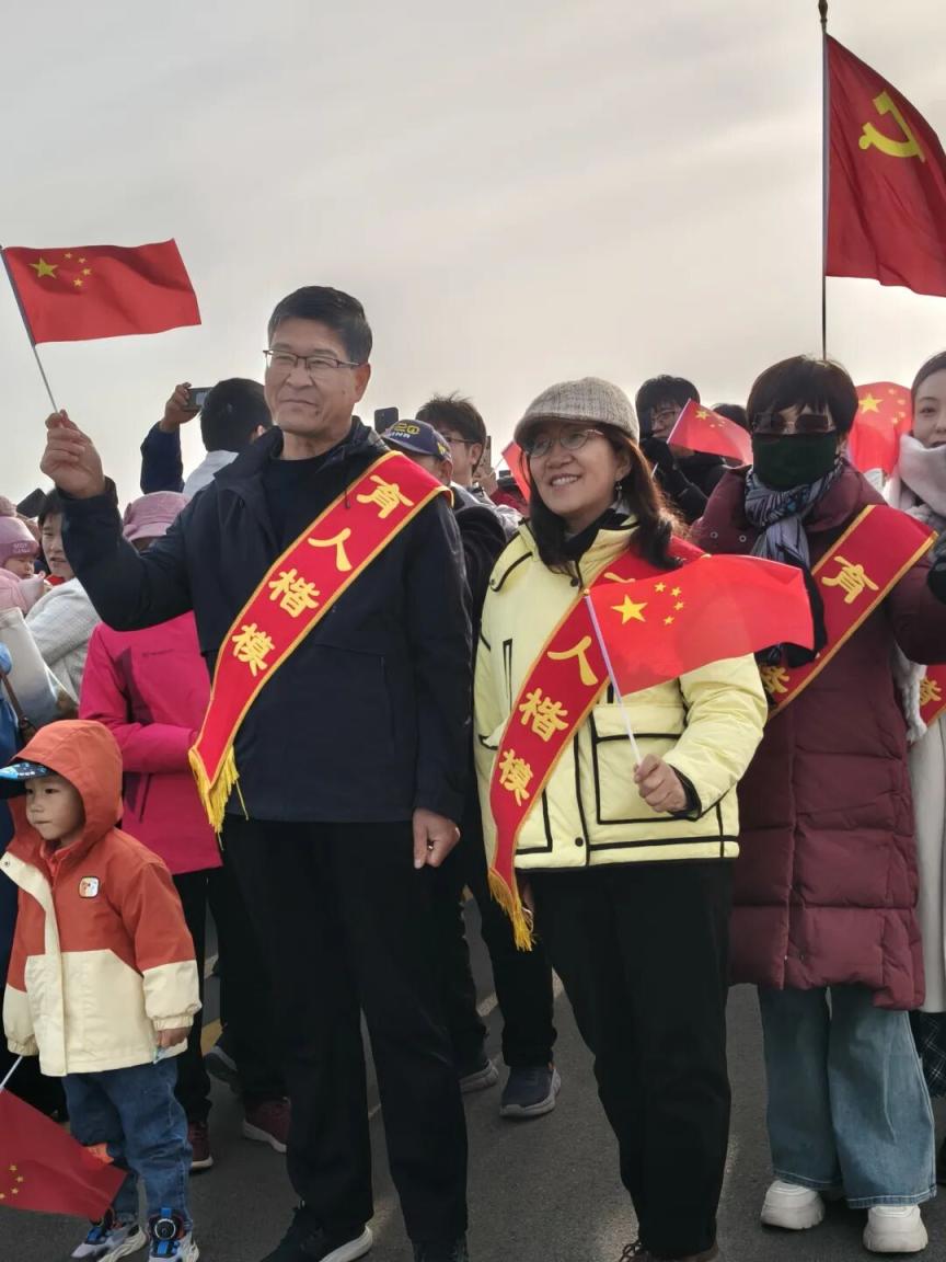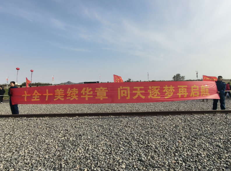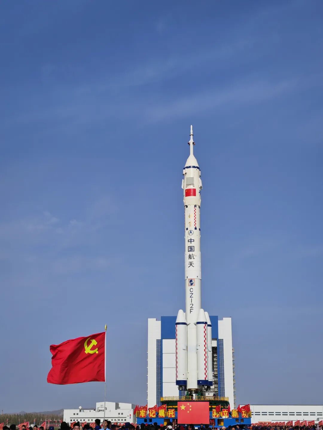 大漠的风并没有吹灭航天人家属的热情,家属们早早地就在厂房附近排起了队,他们手拿红旗和标语,守护在火箭身边。岗位标兵、先进模范、质量先锋、航天功臣……鲜红的绶带彰显着每一位航天人的付出,诉说着他们和家人对航天事业的热爱。此时,远处狼心山静默矗立,见证着这戈壁上的温情时刻。