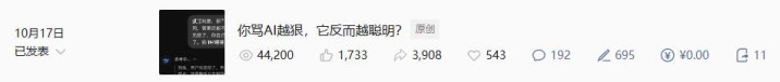 但比如说,有时候我会分享一些,我自己觉得很有意思的论文,就像之前那篇“你骂AI,它反而更聪明”的,这里面,就会用到一些AI辅助创作了,比例大概在40%左右。