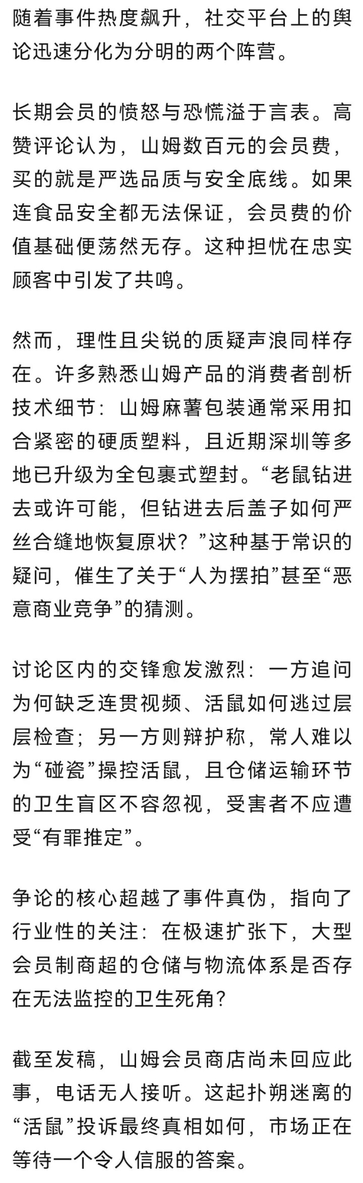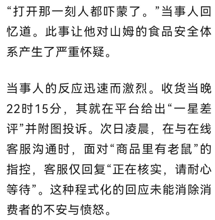 被视为中产阶级消费品质标杆的山姆会员商店,正面临一场突如其来的信任危机。12月9日凌晨,一则“深圳山姆极速达麻薯盒中发现活老鼠”的消息在社交平台快速传播,一个小时讨论已达600余人次。