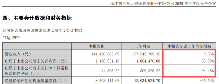 2025年上半年,向日葵的营业收入同比下降8.33%至1.44亿元,归母净利润同比下降35.68%至116.07万元,扣非后净利润同比下降94.46%至4.48万元。